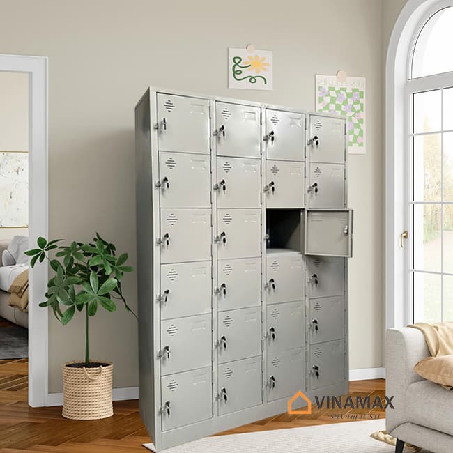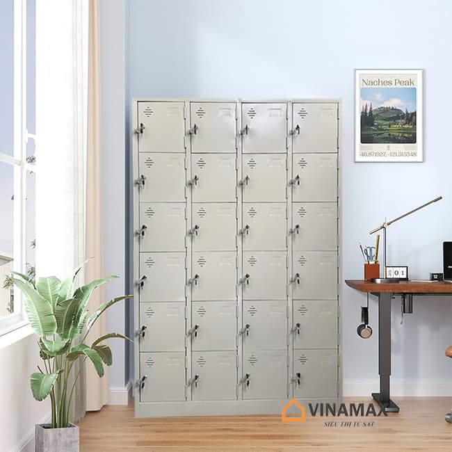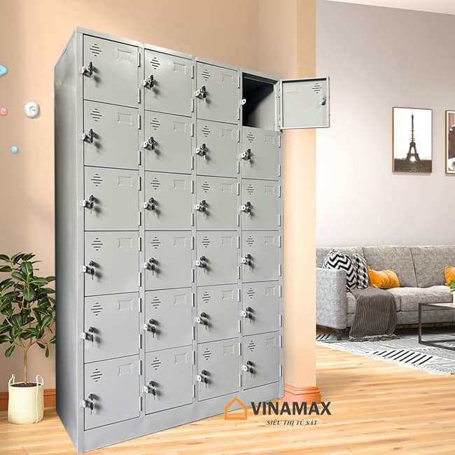 Tủ sắt 24 ngăn là tủ lưu trữ đồ đạc của nhân viên trong văn phòng. Tủ sắt locker thiết kế dạng hộp. Phân bố thành các ngăn tủ nhỏ cung cấp không gian lưu trữ cho mỗi cá nhân.Tủ khóa 24 ngăn mang đến cho nhân viên cảm giác an toàn cho đồ đạc cá nhân của mình. Nguy cơ đe dọa mất cắp, thất lạc đồ đạc không chỉ đến từ đồng nghiệp mà còn từ khách đến thăm hoặc khách hàng thường xuyên đến địa điểm đó.