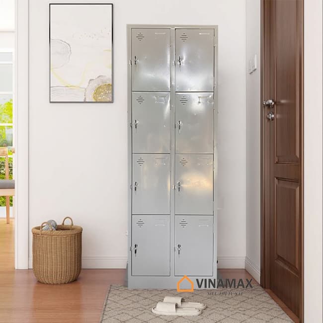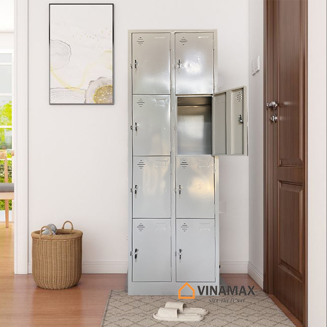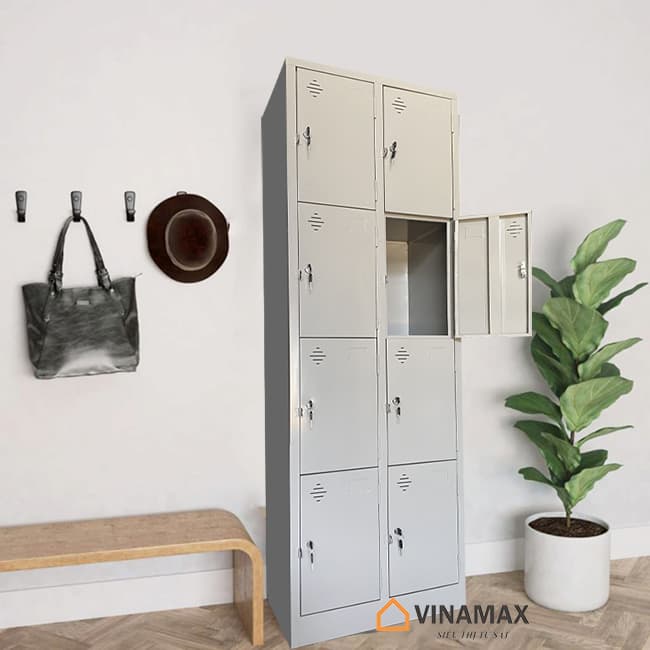 – Thiết kế tiện dụng: Chất liệu tạo nên loại tủ sắt này là sắt sơn tĩnh điện có độ bám dính cao bền đẹp với thời gian, chịu lực chịu tải tốt. Tủ bao gồm 8 ngăn, có 8 cánh cửa mở. Mỗi cánh cửa của một ô tủ đều được trang bị một ổ khóa cá nhân gồm 2 chìa có đánh số thứ tự tên tương ứng. Người sử dụng sẽ được toàn quyền sử dụng ô để đồ riêng.