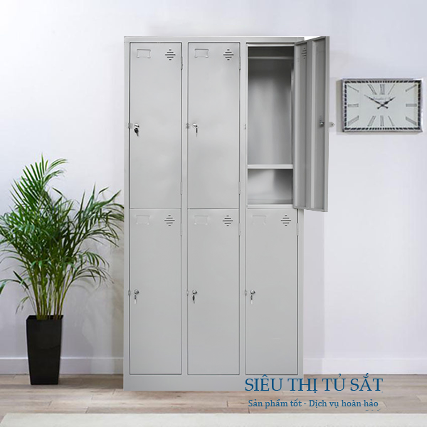 Tủ sắt treo quần áo 6 ngăn dùng cho các khu công nghiệp có số lượng công nhân viên nhiều. Tủ treo quần áo 6 ngăn được chia làm 3 buồng, mỗi buồng 2 tầng, chia làm 6 ngăn đều nhau, có tay nắm, ổ khóa riêng biệt.