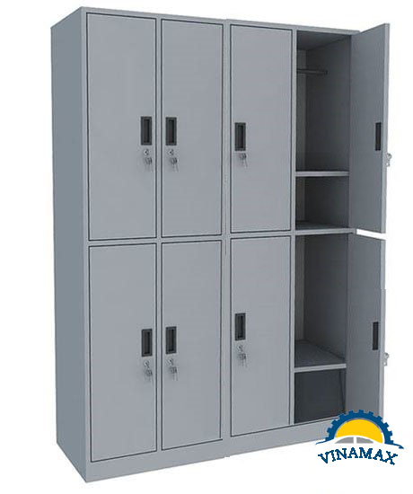 Tủ sắt treo quần áo 8 cánh có kích thước rộng 1200mm, sâu 450mm, cao 1830mm chia làm 8 ngăn để quần áo. Mỗi ngăn đều có suốt treo quần áo và khay để đồ riêng.